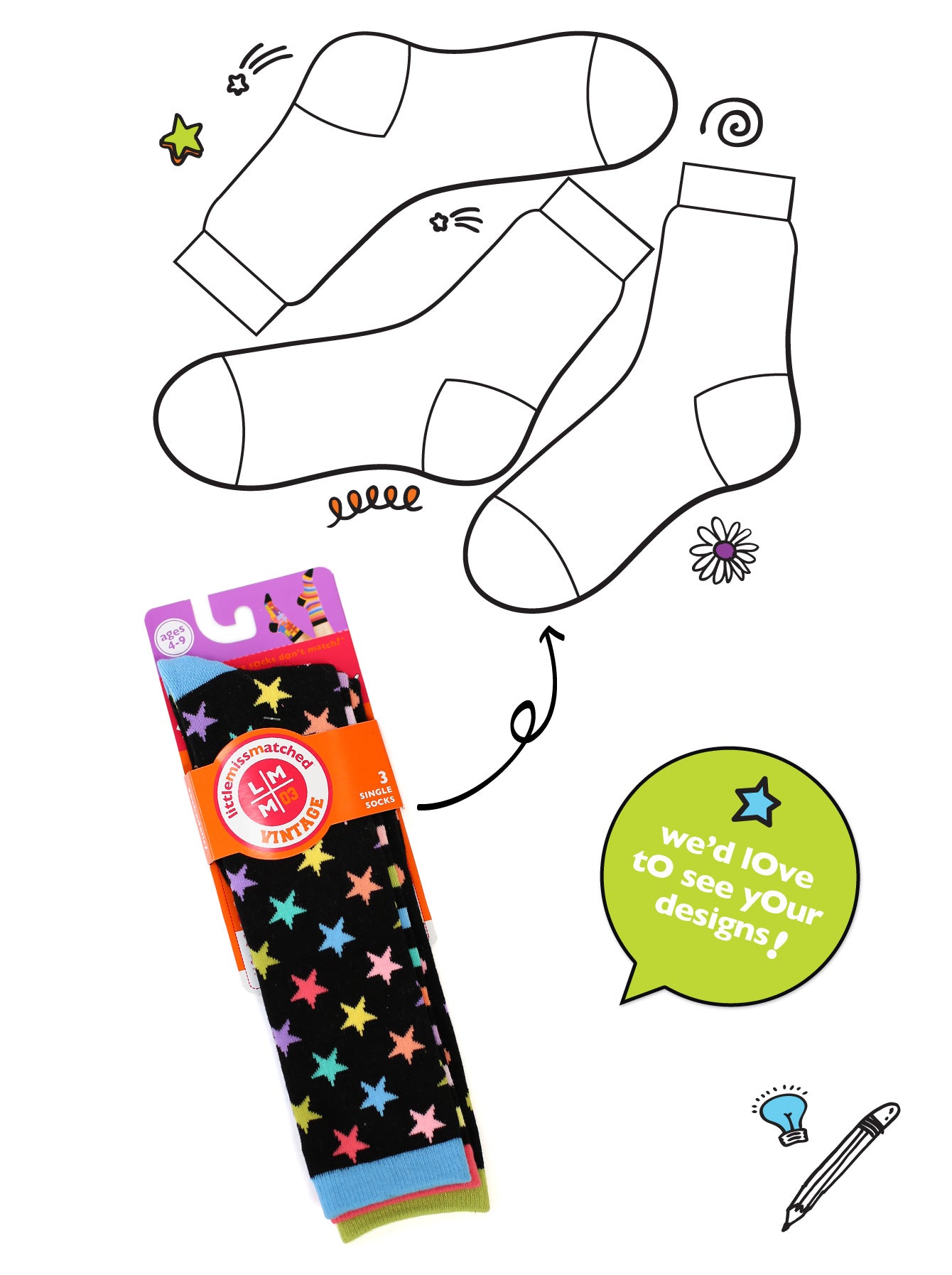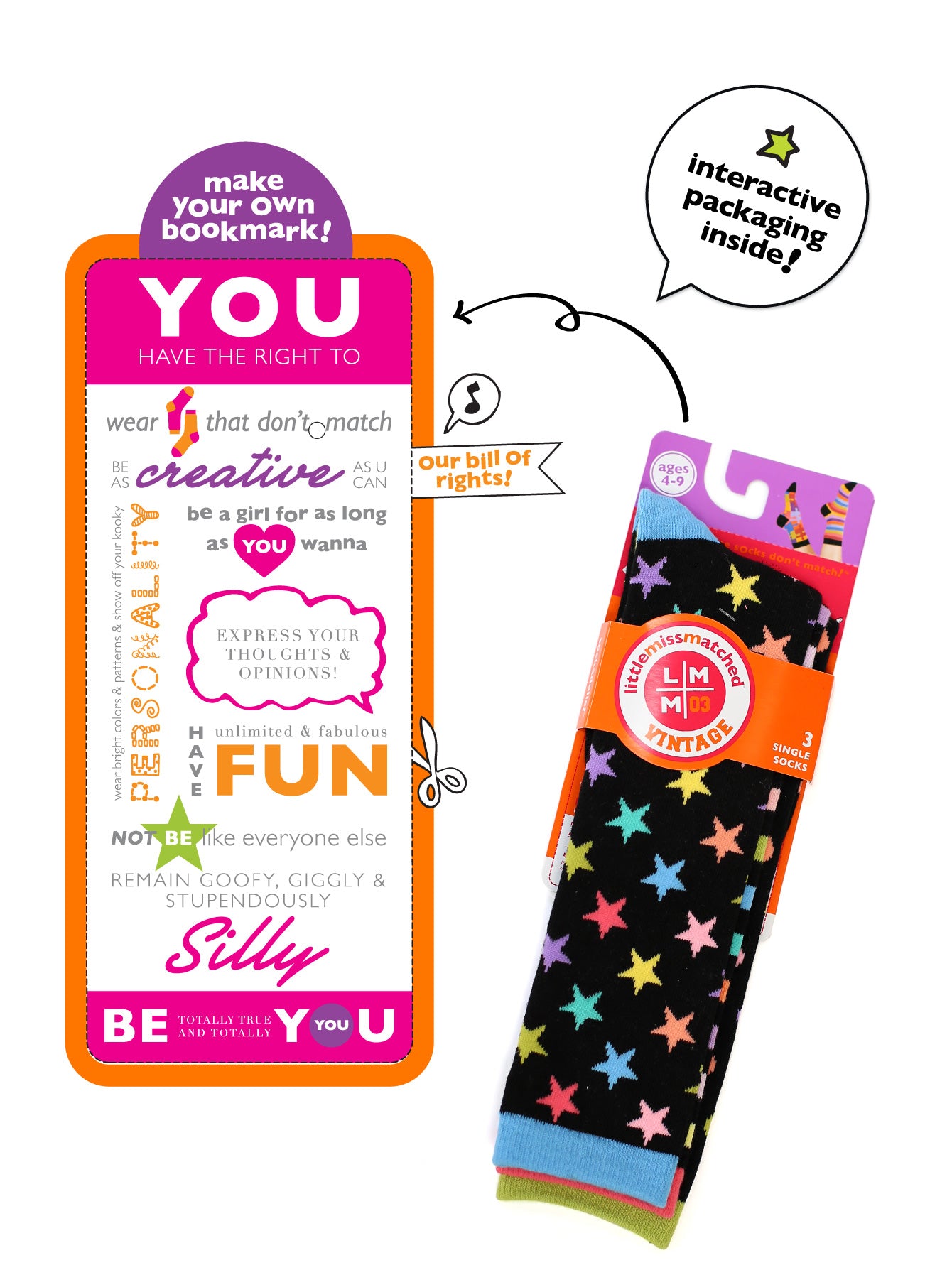 Each Vintage Collection sock pack comes with fun interactive packaging! Cut out your own LittleMissMatched Bill of Rights bookmark or create your own YOUnique sock design on our included template and send it back to us - we'll send you a surprise back!